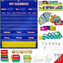 カレンダーとウェザーポケットチャート カード148枚付き (イラスト付きアクティビティカード108枚 ドライ消せるフラッシュカード40枚 フック3個 28インチ x 35.5インチ)