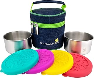 The Pinwheelers 積み重ね可能デュオ | ミニステンレススチールコンテナ 断熱ランチバッグ付き | 2個セット 100%漏れ防止シリコン蓋付き | 再利用可能 環境に優しい 積み重ね可能 ポータブル 220ml (each container)