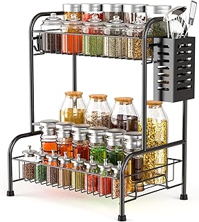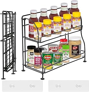HOMOH スパイスラックオーガナイザー カウンタートップ用 2段スパイスオーガナイザー キッチンキャビネット用 折りたたみ式調味料オーガナイザー スタンドストレージ ガードレールデザイン シェルフライナー付き パントリー バスルーム オフィス用
