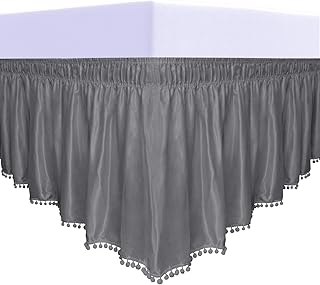 PureFit サテンシルクポンポン ラップアラウンド ベッドスカート 調節可能なゴムベルト付き 16インチドロップ 簡単設置 しわ防止 ダストフリル ベッドフレームカバー ツインXL フルサイズベッド用 ダークグレー