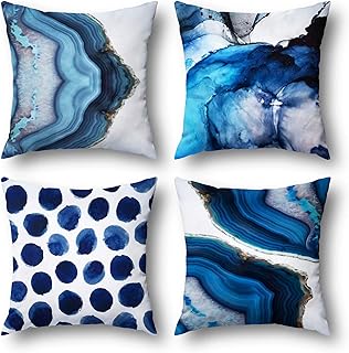 Wyooxoo 装飾枕カバー4枚セット ネイビーブルーマーブルドット 海の質感 18x18インチ 正方形 ソファー リビングルーム カウチ用 コットンリネン100% ベッド ソファ リビングルーム カウチ用 (07Wave)