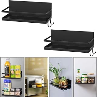 Ambuker 磁気スパイスラック オーガナイザー 冷蔵庫用 スパイスラック 棚 取り外し可能なフック2個付き 強力なマグネットストレージ キッチン/アパートのスペースを節約 2個パック (ブラック)