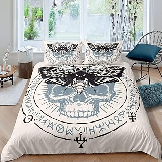 Feelyou Death Moth 掛け布団カバーセット スカルプリント寝具セット キッズ ボーイズ ティーン テラースケルトンパターン 掛け布団カバー ヒッピートリッピーアート ホームインテリア寝具 掛け布団カバー1枚 + 枕カバー2枚 ベージュ (クイーン)