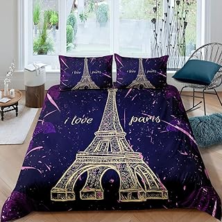 Feelyou エッフェル塔掛布団カバーセット 世界的に有名なシックなパリのテーマ 掛け布団カバー キッズ ボーイズ ガールズ ティーン パリ シティスケープ プリント マイクロファイバー 寝具セット 装飾 キルトカバー キングサイズ パープル