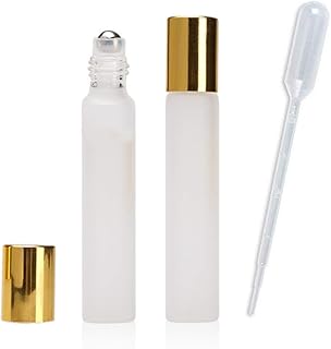 12個 10ml 詰め替え可能 空のつや消しガラスローラーボトル 小瓶 コスメティックコンテナ ステンレススチールローラーボールとゴールドキャップ付き エッセンシャルオイル アロマセラピー 香水 リップクリーム用 3ml ドロッパー