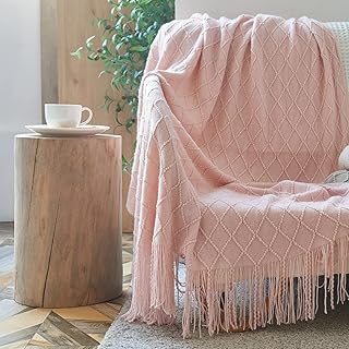ブランケット ひざ掛け 毛布 ニット 軽量 大判 北欧 防寒 冷房対策 洗える 暖かい 掛け毛布 ソファ オフィス 車用 ひざ掛け 肩掛け 無地 フリンジ付き (ピンク, 127*152cm)